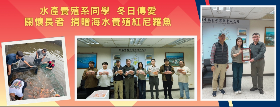 本校水產養殖系學生以實際行動回饋社會,於12月9日下午赴澎湖老人之家,捐贈自費親自培育之全海水養殖紅尼羅魚。由養殖系主任曾建璋、施志昀教授與主任秘書陳宏斌陪同三位養殖系學生到場致贈,並由澎湖老人之家秘書兼室主任王語莉代表受贈,為長者送上冬日暖心的鮮美滋味。