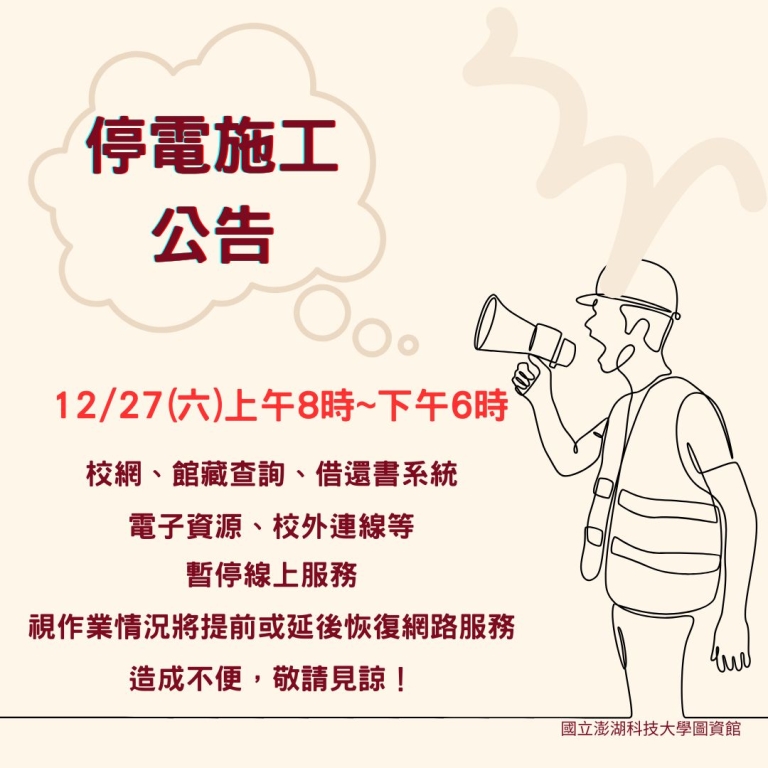 本校圖資館因電力設備維護訂於114年12月27日8:00-18:00停電,暫停網路服務 ,造成不便敬請見諒!!