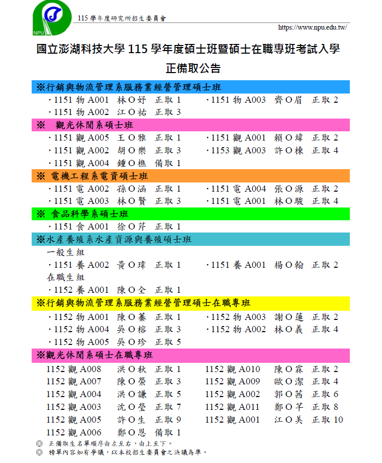****請正取生收到信件後,於115年4月10日(星期五)前將個人基本資料單及入學切結書、畢業證書,以限時掛號郵寄(以郵戳為憑)回寄或親送至本校教學大樓一樓教務處註冊組。欲放棄錄取之考生,請務必填寫放棄錄取資格聲明書,郵寄或傳真至本校。