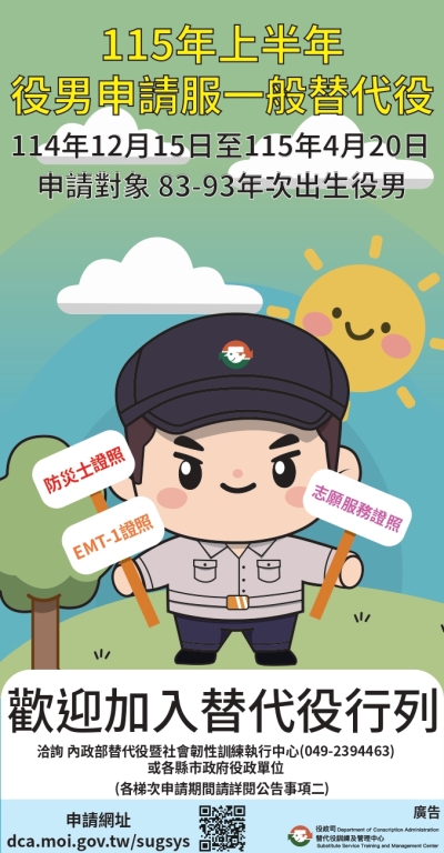 【學生兵役】115年上半年役男申請服一般替代役甄選作業