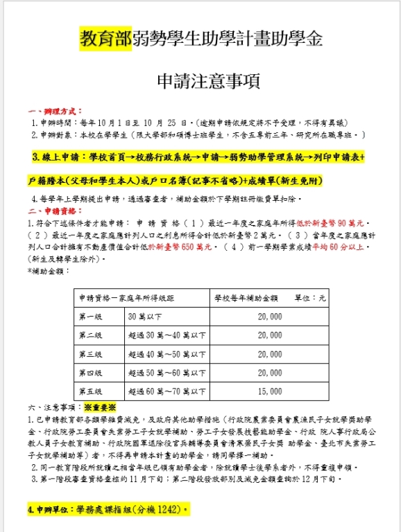 3.線上申請:學校首頁→校務行政系統→申請→弱勢助學管理系統→列印申請表+