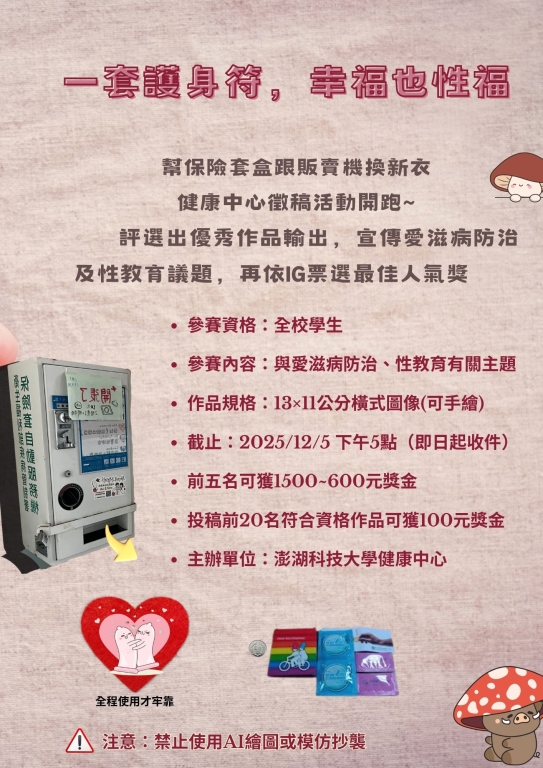 透過這次競賽,我們希望大家能更了解安全性行為的多重好處,保險套不僅是避孕的工具,更是防範性傳播疾病的重要方式,特舉辦「一套護身符,幸福也性福」圖像徵稿。透過評審選出前5名,將輸出製成貼紙(張貼在保險套設計包裝、販賣機外)或其他文創品等,再依IG票選最佳人氣獎。