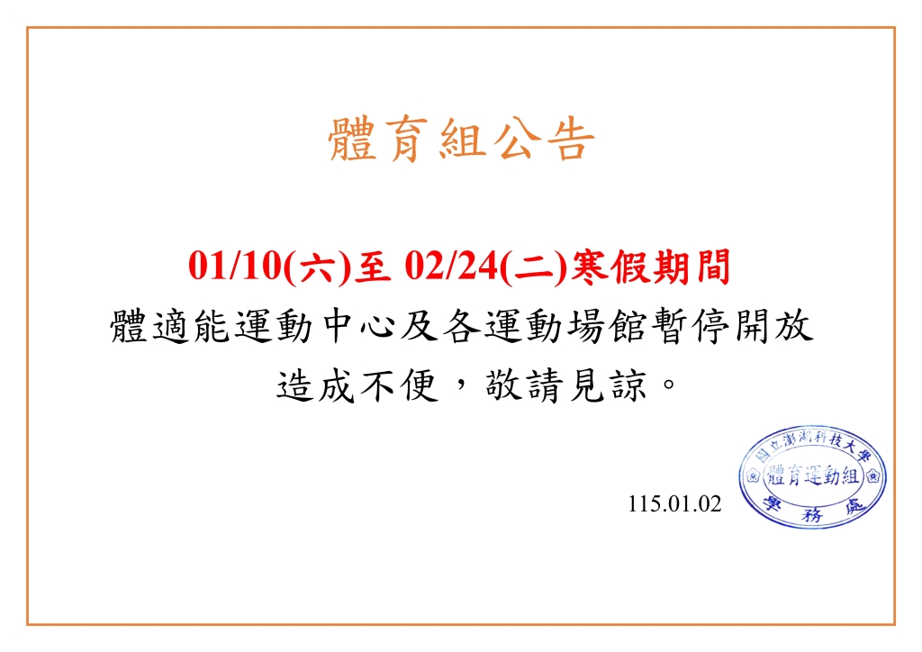 【體育組公告】01月10日至02月24日寒假期間體適能運動中心及各運動場館暫停開放