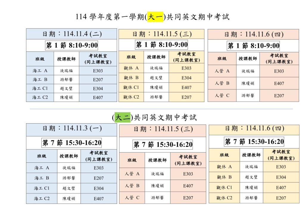 114-1學期-共同英文「大一」及「大二」--期中考時程表-通報