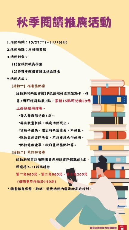 【活動】圖書館10/27~11/16辦理「秋季閱讀推廣活動」,歡迎踴躍參加!
