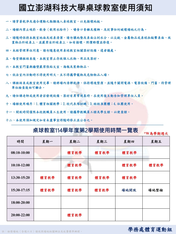 國立澎湖科技大學114-2桌球教室使用須知