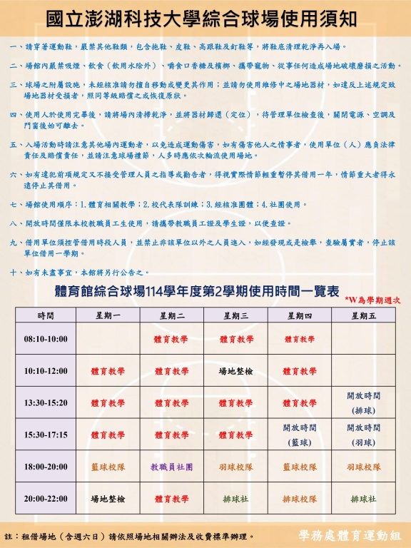國立澎湖科技大學114-2各體育場館場地使用須知及使用時間一覽表