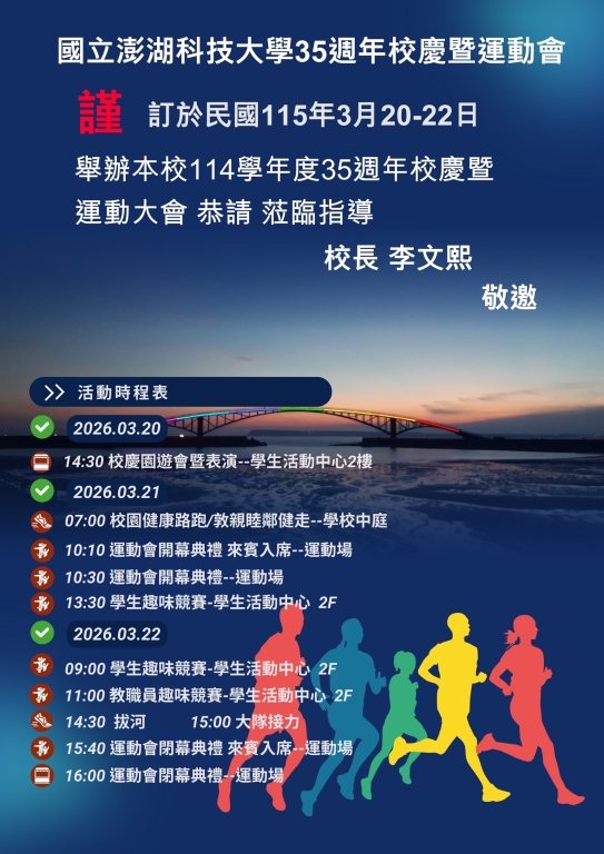本校3/20-3/22舉辦35週年校慶暨運動大會(議程表如附)~~歡迎共襄盛舉蒞臨指導