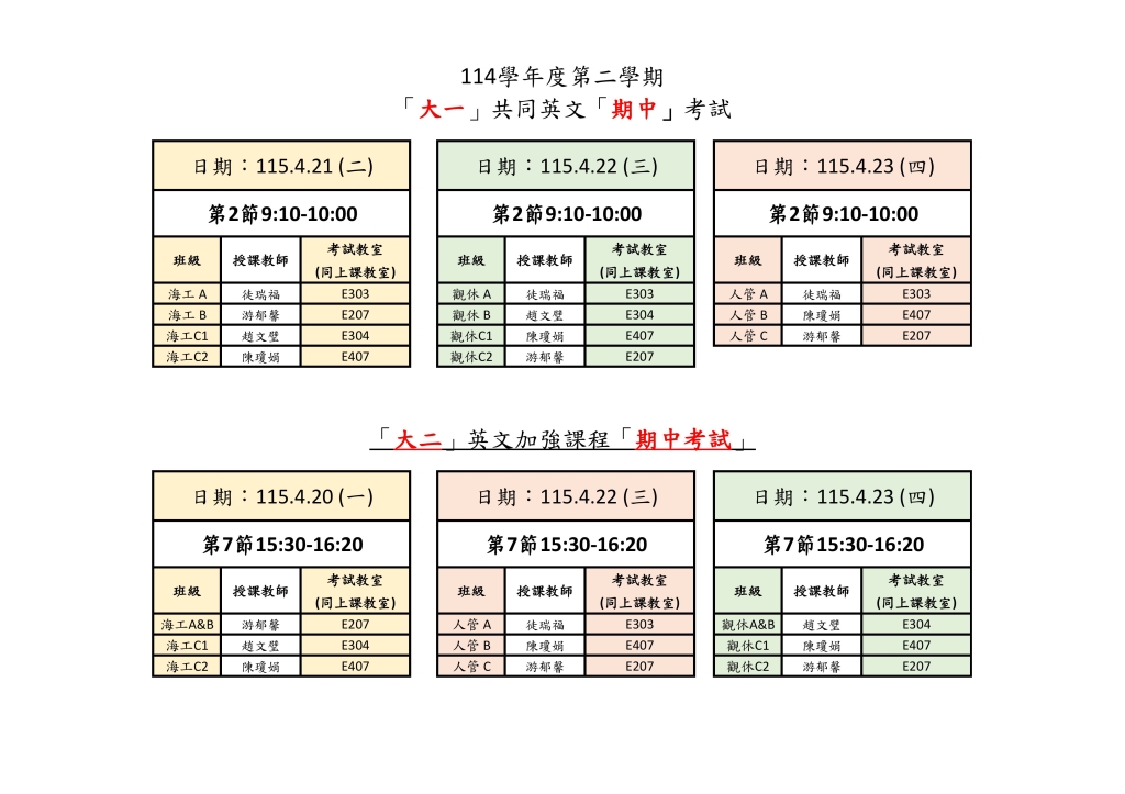 114-2學期-共同英文「大一」及「大二」--期中考時程表