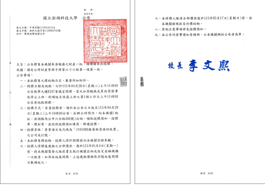 本校115年報廢品⼀批財物變賣公告115.04.14