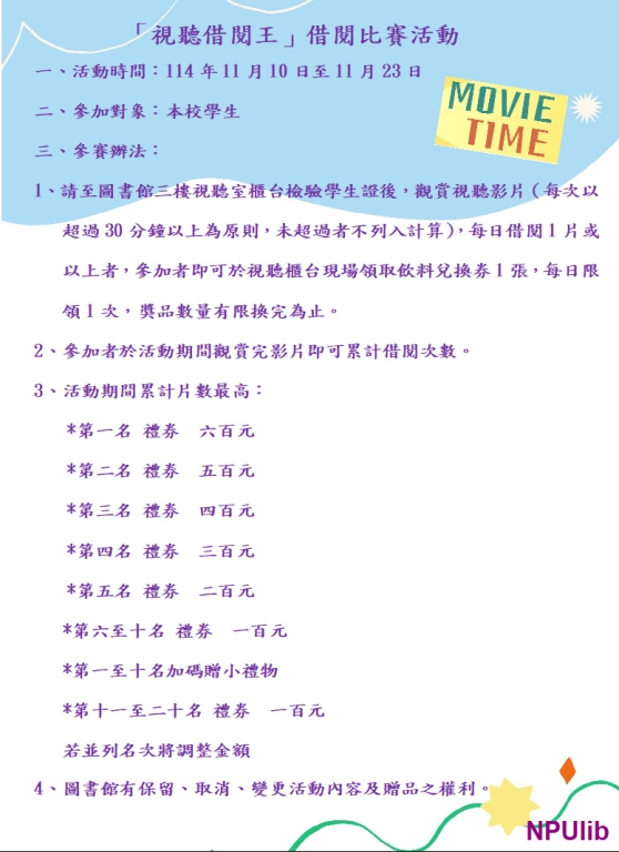 4、圖書館有保留、取消、變更活動內容及贈品之權利。