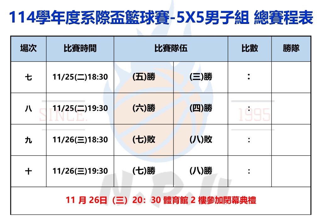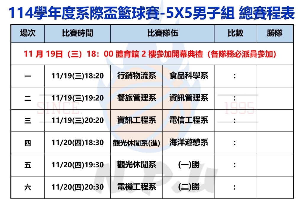 國立澎湖科技大學114學年度全校系際盃籃球錦標賽-5X5男子組 新版賽程表-1