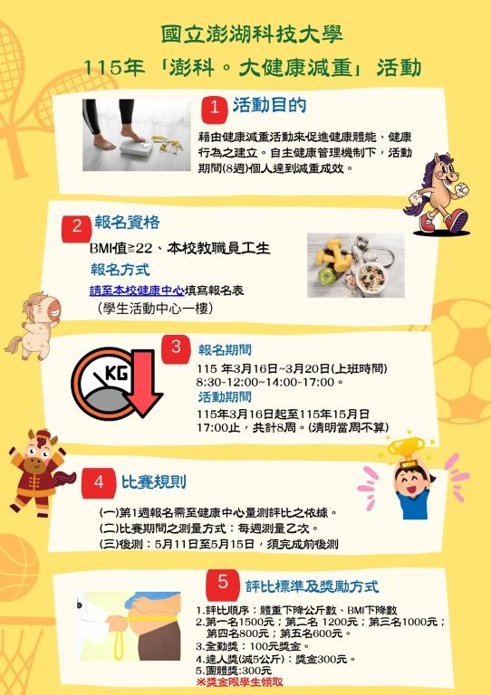 健康中心115年健康促進學校計畫:"澎科。大健康減重活動"3/16-3/20報名