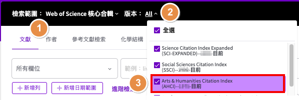 【臺灣學術電子資源永續發展計畫購置】 專輯全名:Arts & Humanities Citation Index(A&HCI) 起訖時間:111/11/4-112/11/3 資料庫連結:http://webofknowledge.com/WOS 簡介:Arts & Humanities Citation Index®(A&HCI)藝術與人文引文索引資料庫收錄1,800種以上期刊文獻,內容涵蓋考古、建築、藝術、亞洲研究、舞蹈、民俗學、歷史學、語言學、文學、戲劇與宗教等超過28個學科領域。(附件為使用手冊說明及簡介) 科睿唯安官方介紹:A&HCI - Clarivate - Taiwan