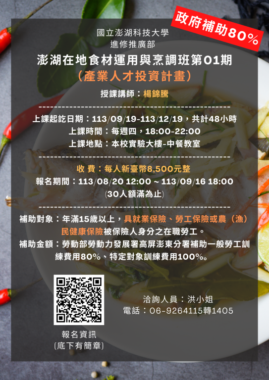 澎湖在地食材運用與烹調班第01期(課程代碼:158128) (08/20開放報名) |
