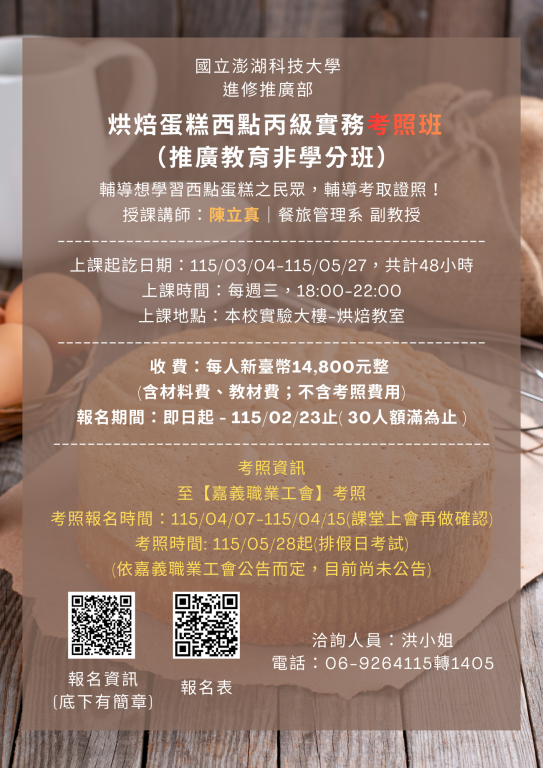 【 烘焙蛋糕西點丙級實務考照班(推廣教育非學分班) 】