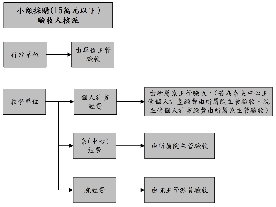 (1) 個人計畫經費由所屬系主管驗收。(若為系或中心主管個人計畫經費由所屬院主管驗收。院主管個人計畫經費由所屬系主管驗收。)