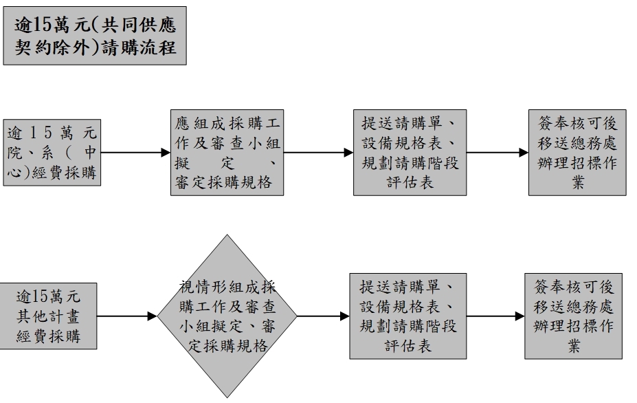 - 5萬元以上之採購應由使用單位填具請購單並檢附報價單或估價單,經簽准後,始得交貨核銷,核銷時須檢附照片或相關證明文件。