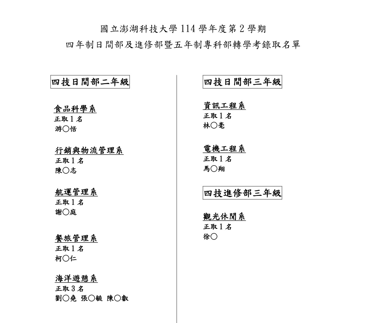 1.錄取名單(如附件),請各位錄取生於115年1月26日(一)下午5時前完成網路報到,逾期未報到者,即視同放棄錄取資格論,缺額由備取生遞補之。 2.錄取生網路報到連結:https://forms.gle/JeBnEg8fhx7iBuxk7