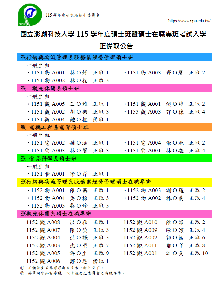 ****請正取生收到信件後,於115年4月10日(星期五)前將個人基本資料單及入學切結書、畢業證書,以限時掛號郵寄(以郵戳為憑)回寄或親送至本校教學大樓一樓教務處註冊組。欲放棄錄取之考生,請務必填寫放棄錄取資格聲明書,郵寄或傳真至本校。