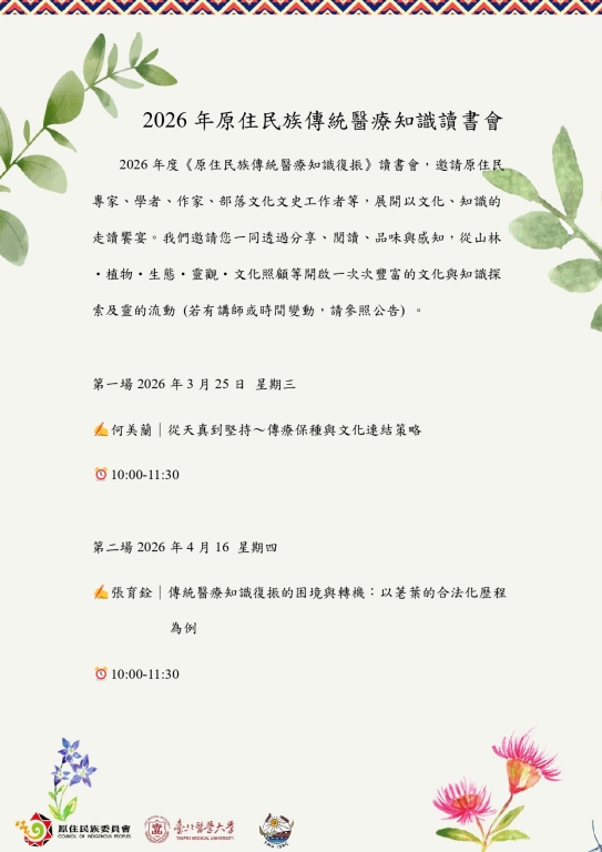 一、為促進原住民族傳統醫療知識之保存、傳承與學習交流,規劃辦理「2026年度原住民族傳統醫療知識復振讀書會」,邀請原住民族專家學者、文化工作者及部落實務者,透過線上講座與交流方式,分享原住民族傳統醫療植物、巫儀文化、靈觀、生態知識及文化照顧等相關議題。
