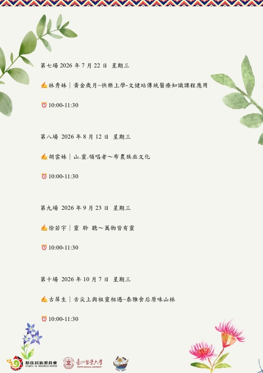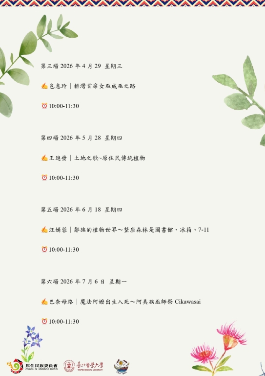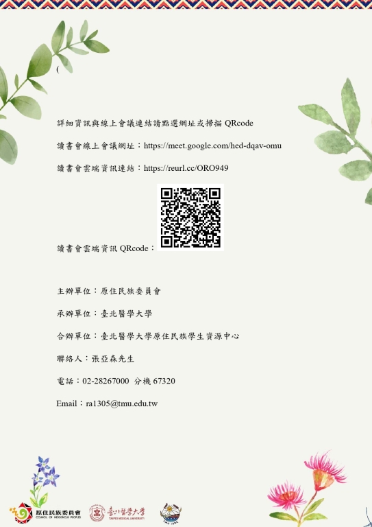 二、本讀書會自今年3月至12月,每月辦理1場次,採線上方式進行,期透過跨領域知識交流,促進青年學子對原住民族文化與傳統醫療知識之理解與關注。